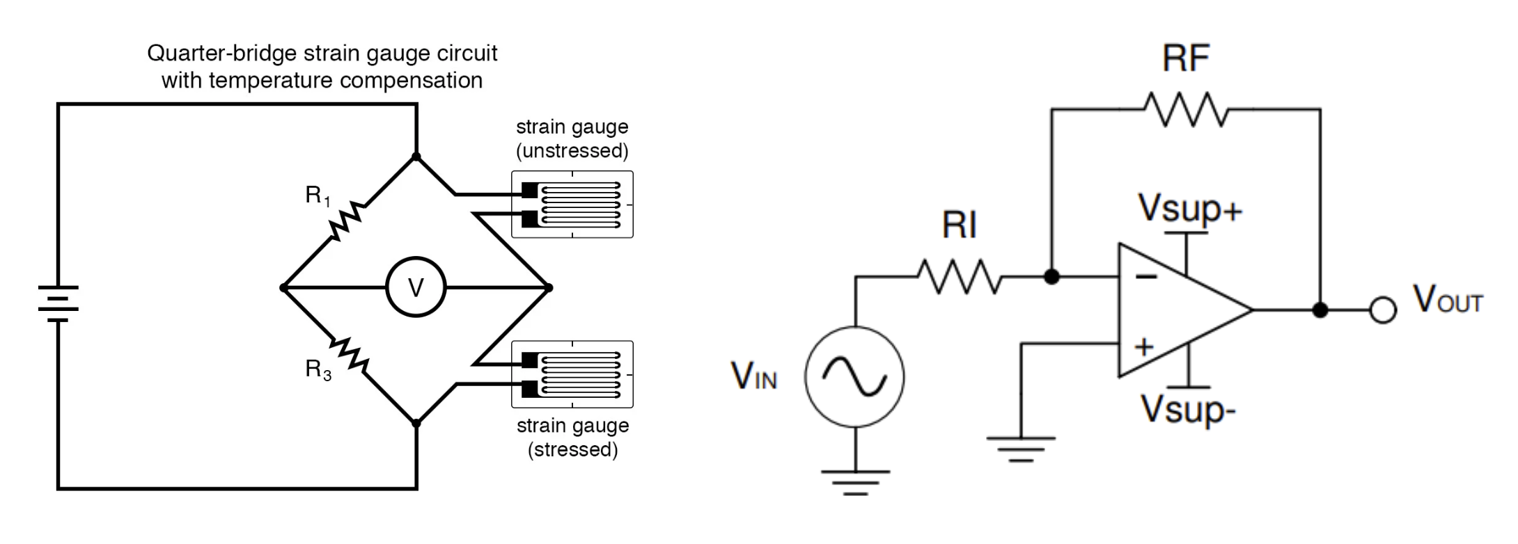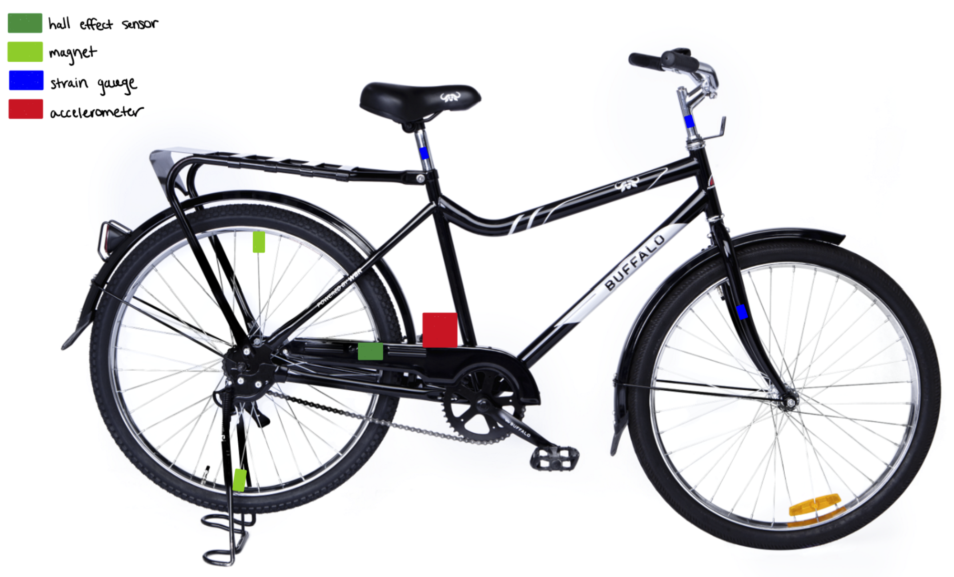 A Hall-effect sensor and magnets measure wheel rotation to track speed and distance, while an accelerometer records terrain-induced vibration and ride dynamics. Strain gauges mounted on key frame locations measure structural loading by detecting small deformations, with an operational amplifier boosting these signals into a readable range.