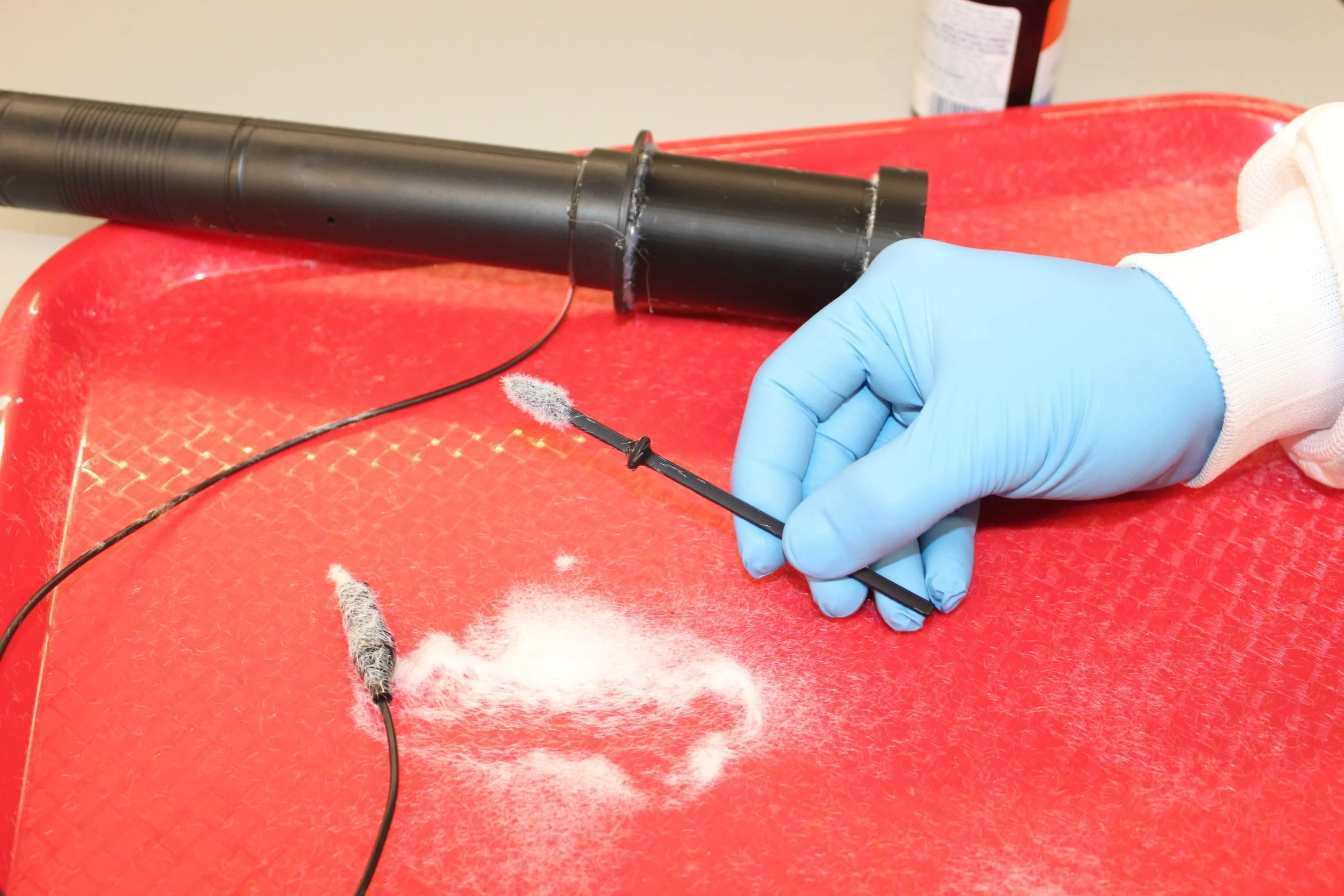 Final swab design. Nylon bristles are electrostatically flocked onto the solid plastic core.
