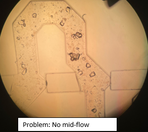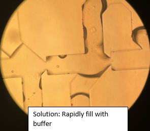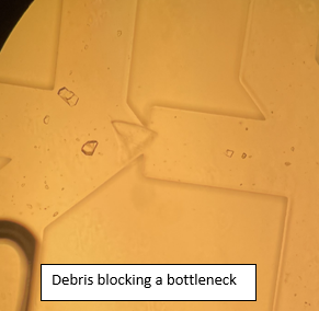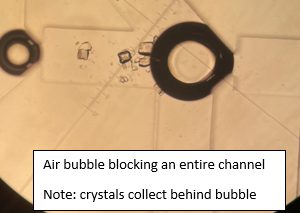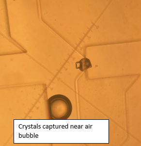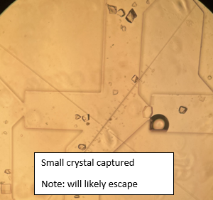 Standardizing priming and loading improved trap reliability. Rapid buffer priming prevented channel bypassing, while controlled injection angles minimized PDMS damage and leakage, stabilizing flow and enabling consistent crystal capture in bottleneck regions.