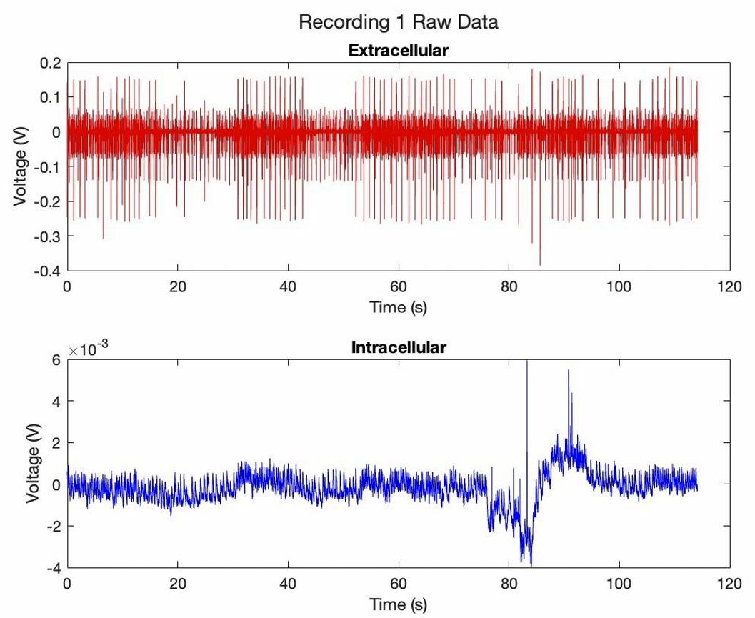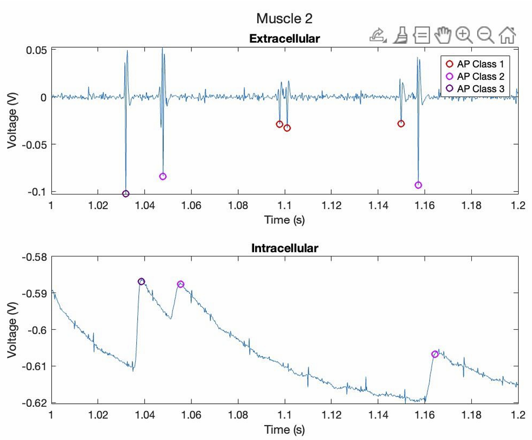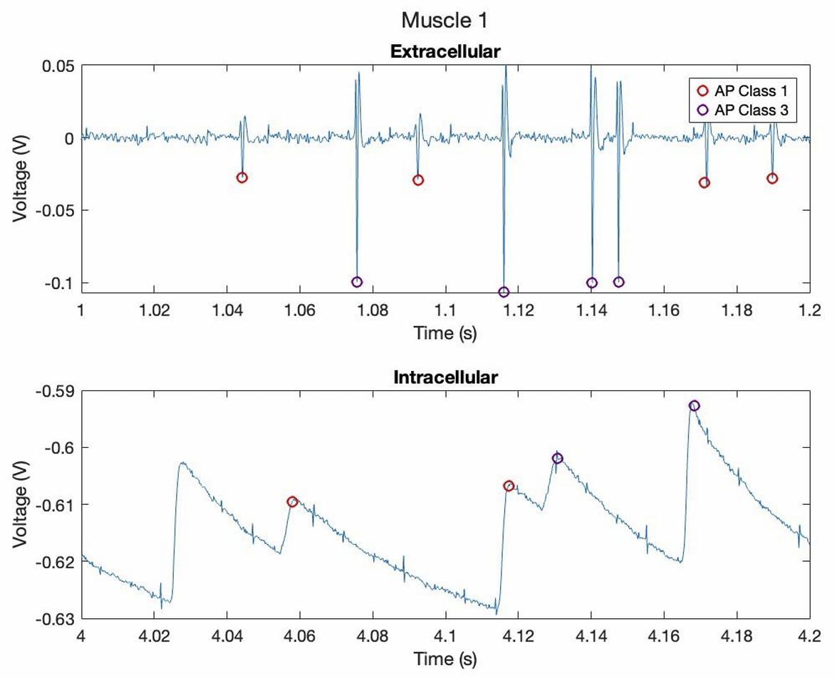 I conducted the background research to inform the design, then performed the dissection, positioned and calibrated extracellular and intracellular electrodes, and collected synchronized voltage recordings under spontaneous and stimulated conditions. The resulting data allowed for classification of action potentials and analysis of corresponding EPSPs and synaptic integration.