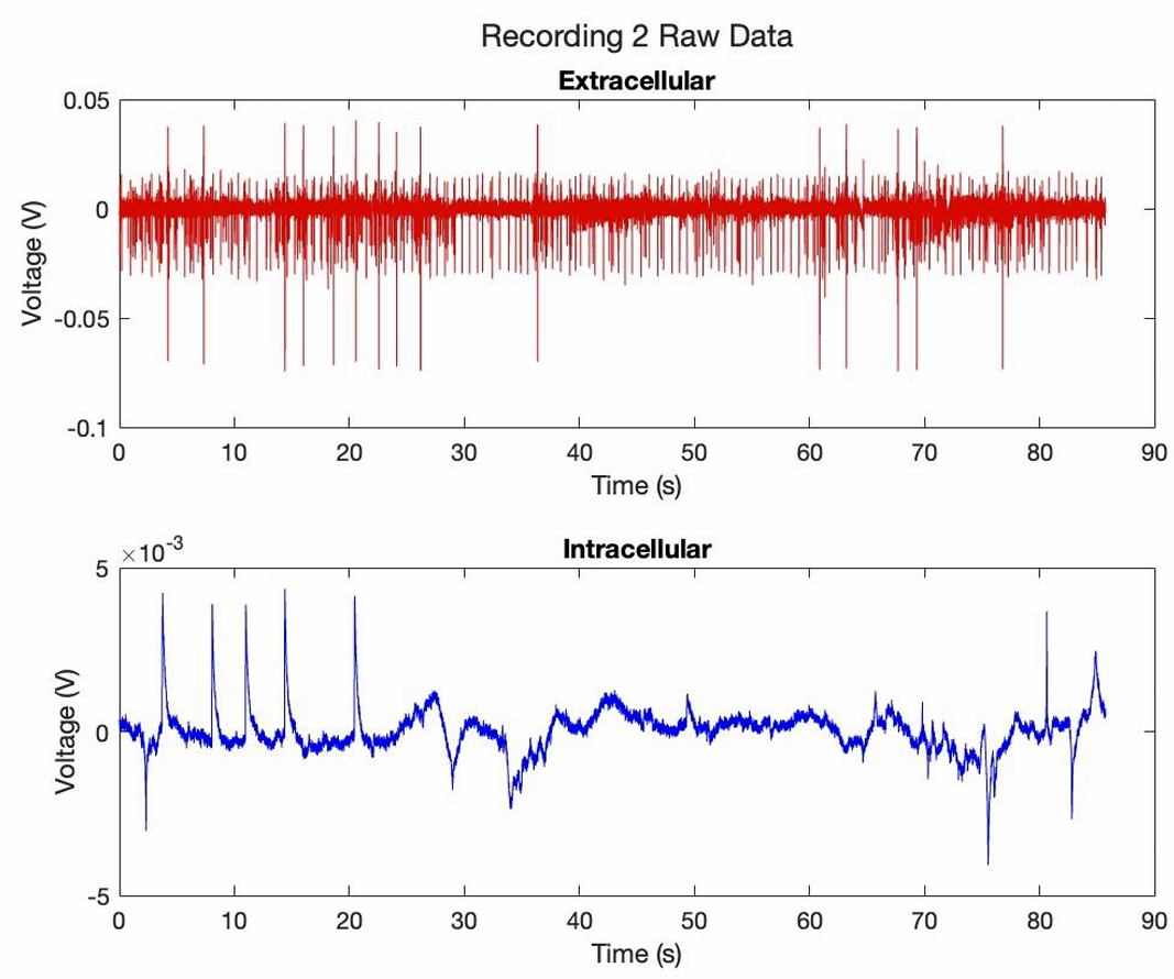 Once calibrated, synchronized extracellular and intracellular recordings were collected under spontaneous and stimulated conditions for analysis.